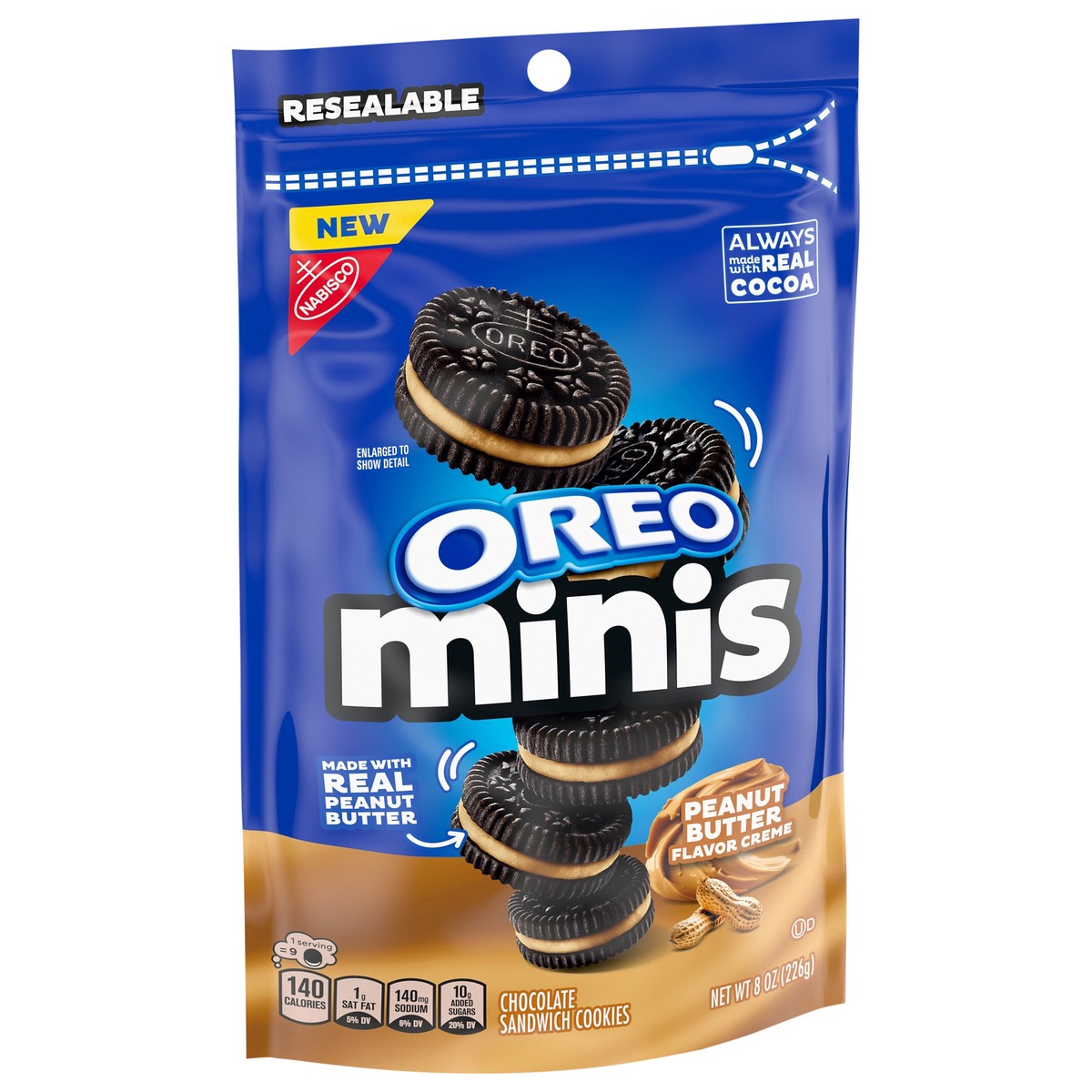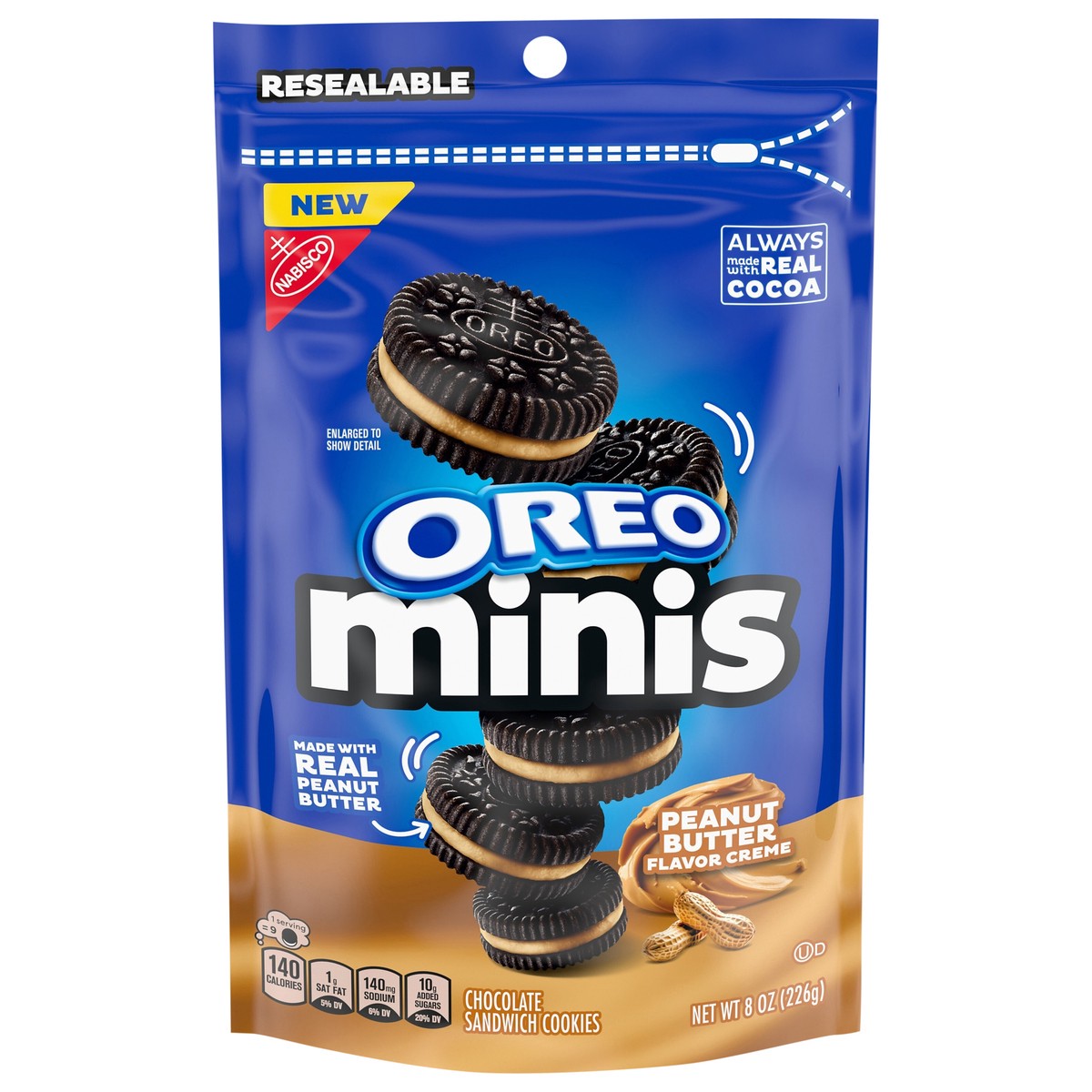 Take a delicious break with OREO Minis Peanut Butter Creme Chocolate Sandwich Cookies. A nutty, tiny twist on classic OREO chocolate cookies, these mini cookies sandwich scrumptious peanut butter crem…