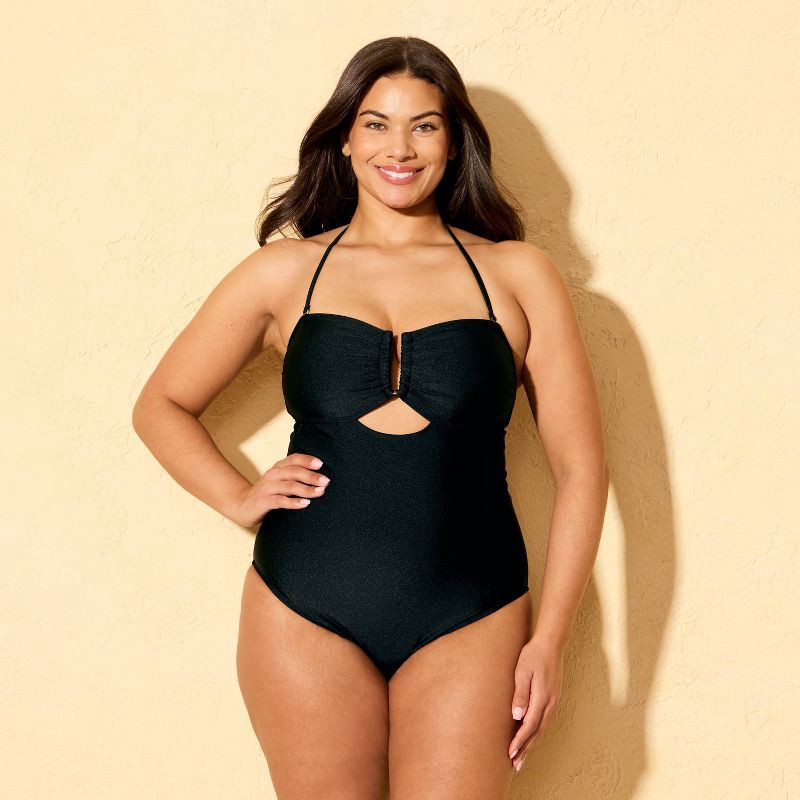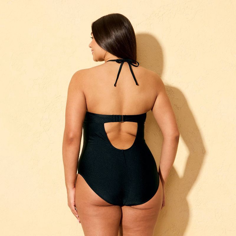 Move in glam style during beach outings wearing the High Shine U-Bar Tummy Control Bandeau One-Piece Swimsuit from Shade & Shore™. The high-shine bandeau swimsuit features a U-bar neckline, keyhole de…