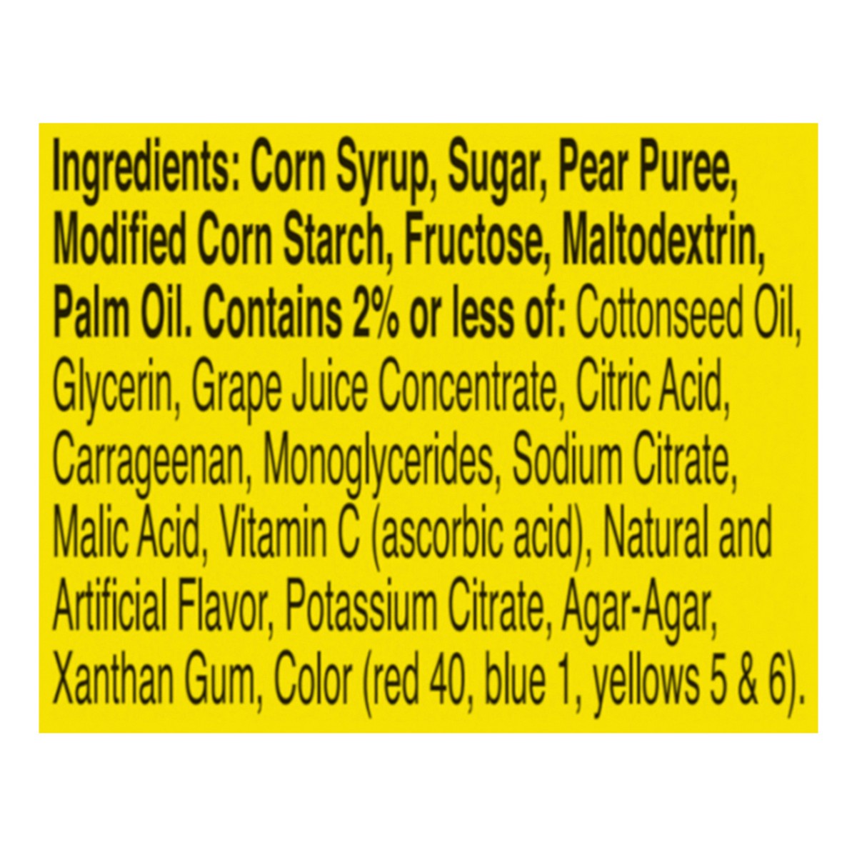Corn Syrup, Sugar, Pear Puree, Modified Corn Starch, Fructose, Maltodextrin, Palm Oil, Contains 2% or Less of: Cottonseed Oil, Glycerin, Grape Juice Concentrate, Citric Acid, Carrageenan, Monoglycerid…