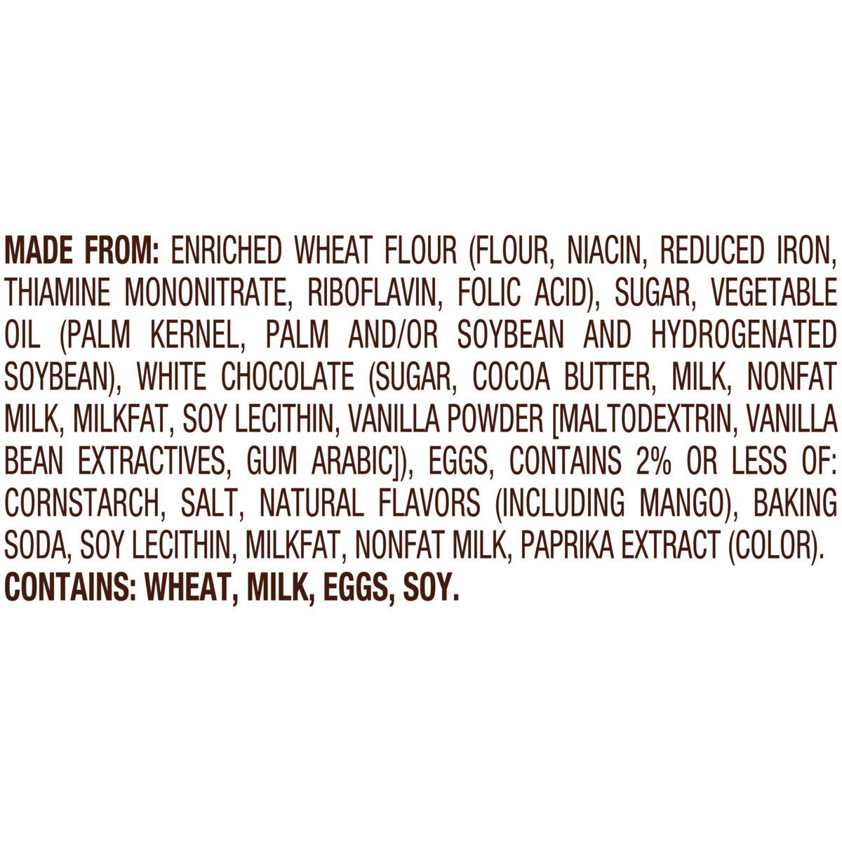 MADE FROM: ENRICHED WHEAT FLOUR (FLOUR, NIACIN, REDUCED IRON, THIAMINE MONONITRATE, RIBOFLAVIN, FOLIC ACID), SUGAR, VEGETABLE OIL (PALM KERNEL, PALM AND/OR SOYBEAN AND HYDROGENATED SOYBEAN), WHITE CHO…