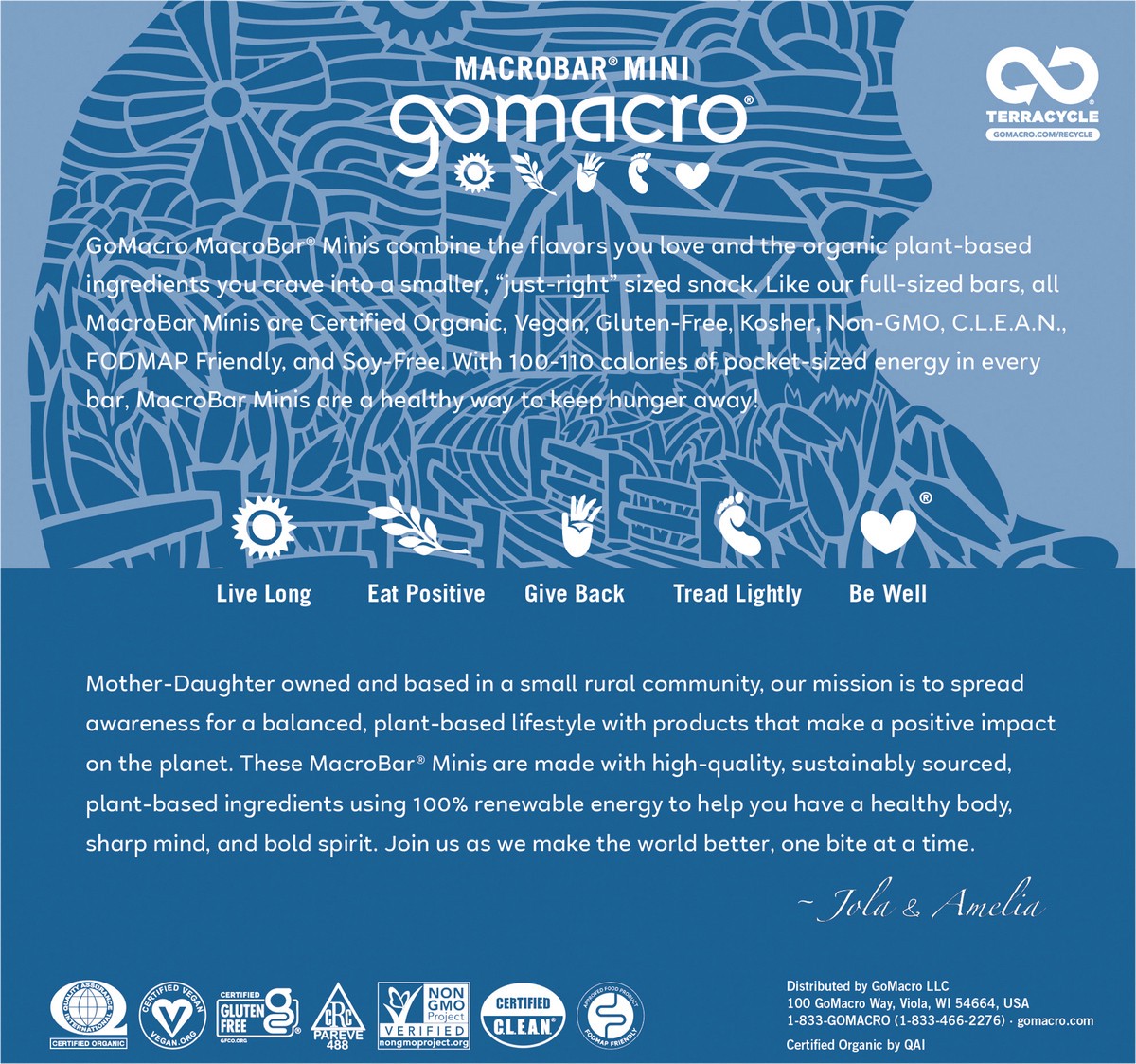 GoMacro MacroBar Minis combine the flavors you love and the organic plant-based ingredients you crave into a smaller, just-right sized snack. Like our full-sized bars, all MacroBar Minis are Certified…