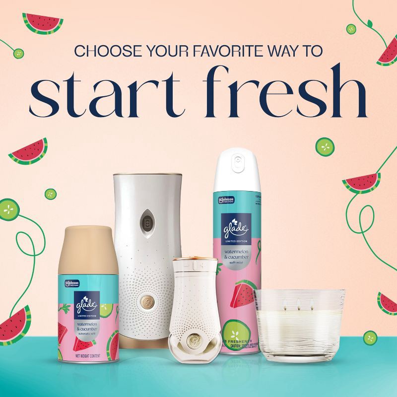 Celebrate spring and the spirit of renewal with the new Glade® Watermelon & Cucumber PlugIns® scented oil. Combining fruity, energizing notes of fresh-cut fruit with a cool, crisp cucumber, this fragr…