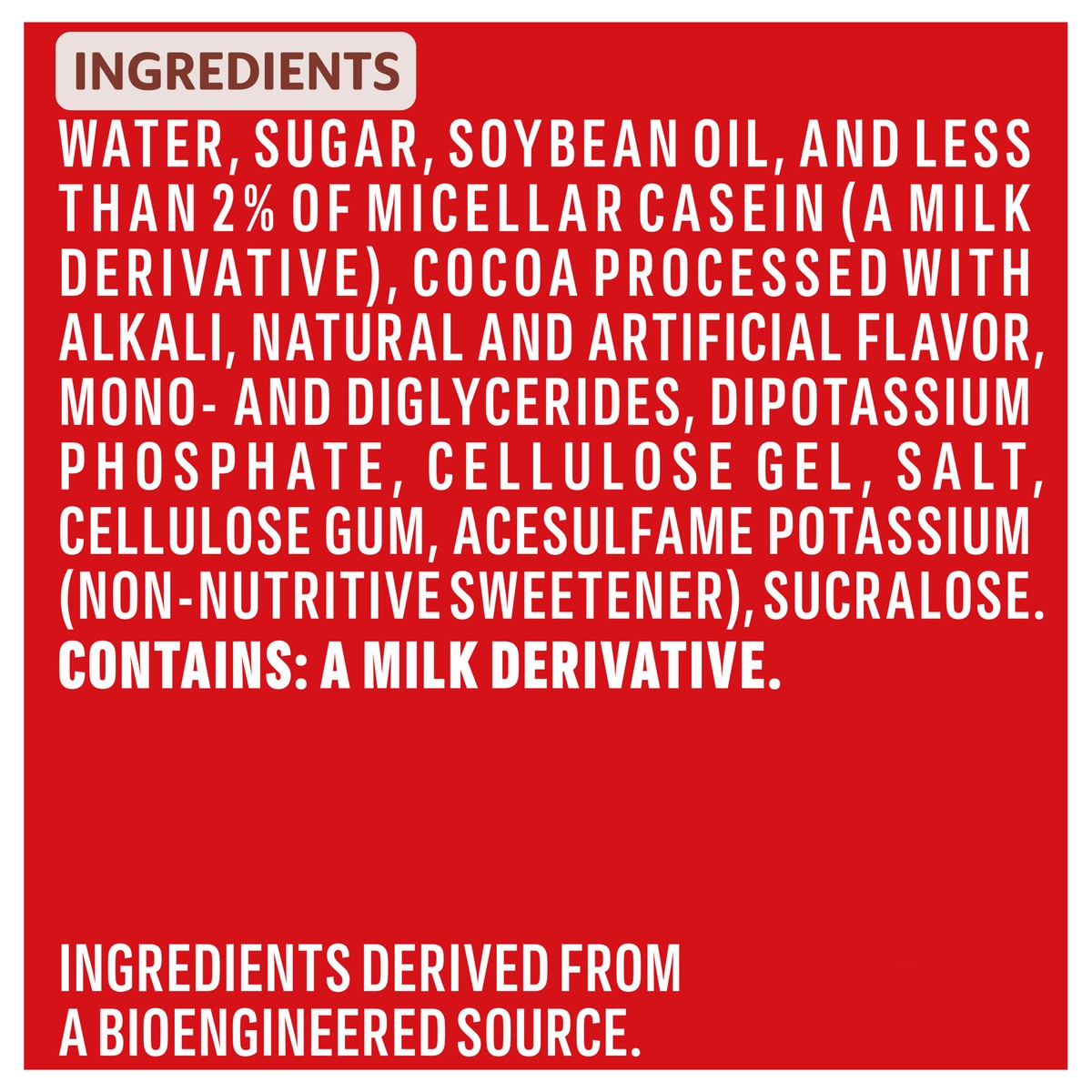 Water, Sugar, Soybean Oil, and Less than 2% of Micellar Casein (a Milk Derivative), Cocoa Processed with Alkali, Natural and Artificial Flavor, Mono-and Diglycerides, Dipotassium Phosphate, Cellulose …