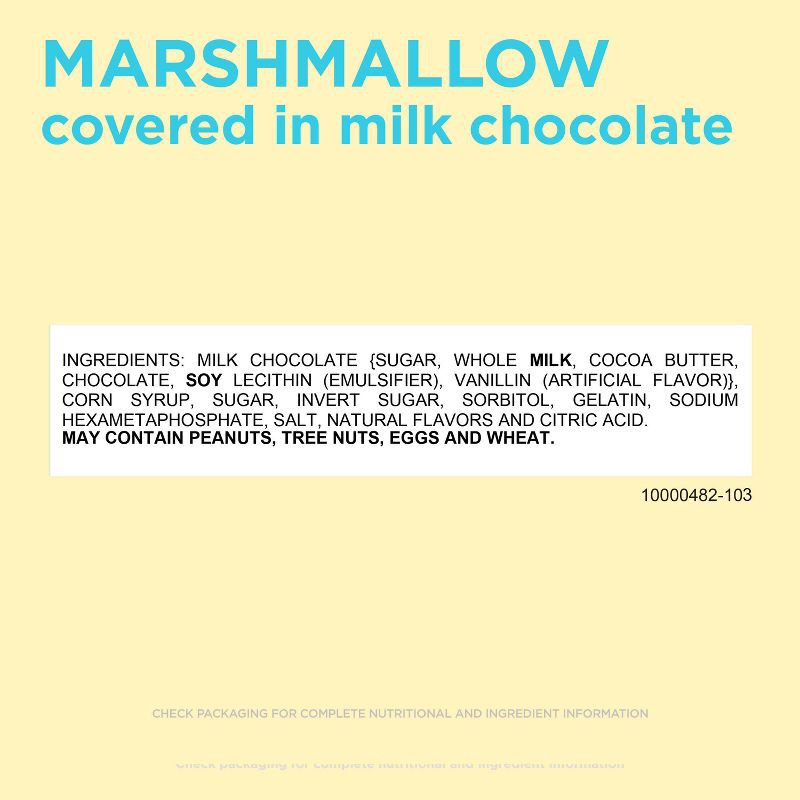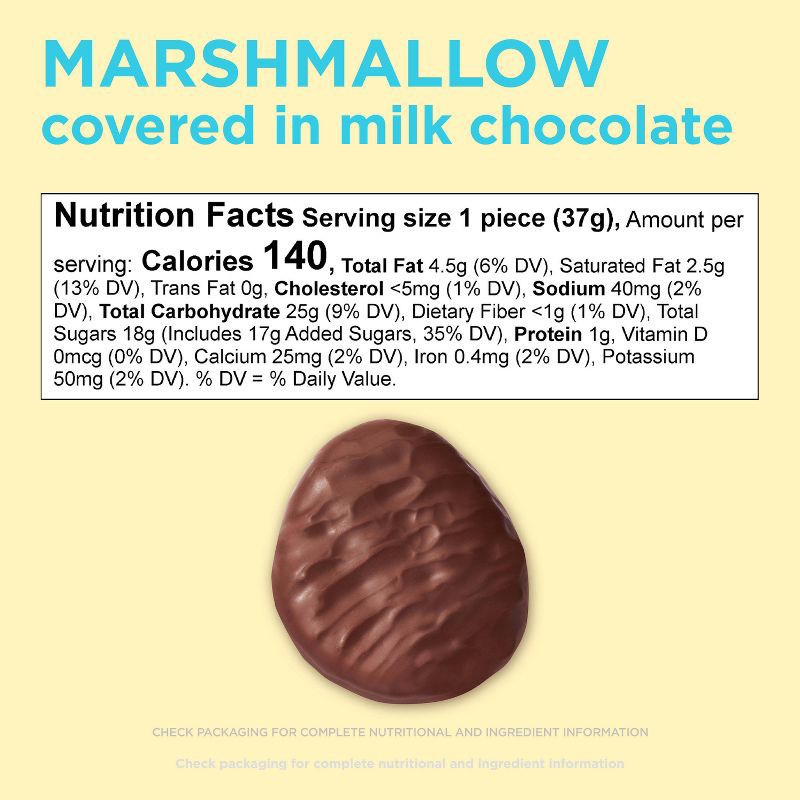 - Each 1.3 oz. egg in this 6-pack has a fluffy marshmallow center covered in our deliciously creamy milk chocolate. Product sold by weight, not volume. Information online not complete, check the label of the actual product being purchased.