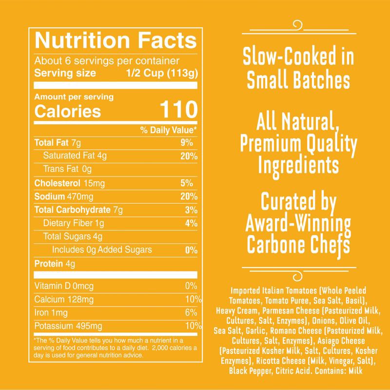Imported Italian Tomatoes (Whole Peeled Tomatoes, Tomato Puree, Sea Salt, Basil), Heavy Cream, Parmesan Cheese (Pasteurized Milk, Cultures, Salt, Enzymes), Onions, Olive Oil, Sea Salt, Garlic, Romano …