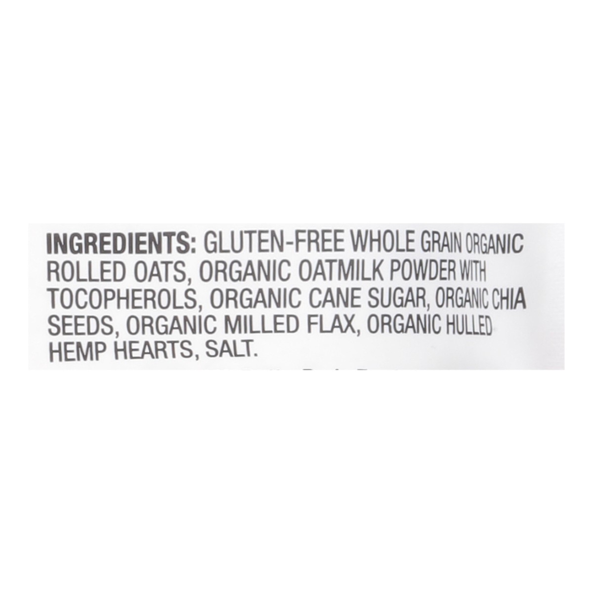 Gluten-Free Whole Grain Organic Rolled Oats, Organic Oatmilk Powder with Tocopherols, Organic Cane Sugar, Organic Chia Seeds, Organic Milled Flax, Organic Hulled Hemp Hearts, Salt.