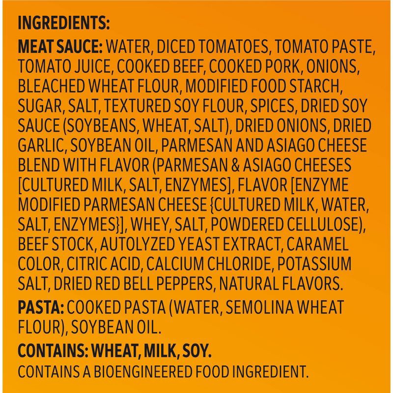 Meat Sauce: Water, Diced Tomatoes, Tomato Paste, Tomato Juice, Cooked Beef, Cooked Pork, Onions, Bleached Wheat Flour, Modified Food Starch, Sugar, Salt, Textured Soy Flour, Spices, Dried Soy Sauce (S…