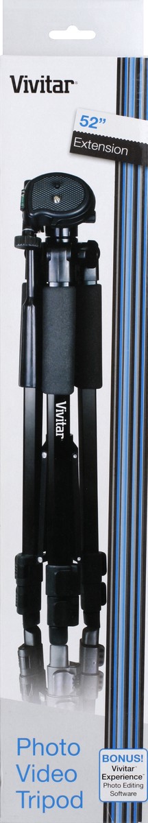 Bonus! Vivitar Experience photo editing software. 52 inch extension. 3 way fluid pan head with bubble level. Quick release mount. Elevated center. 52 inch tripod. 3 way fluid pan head with bubble leve…