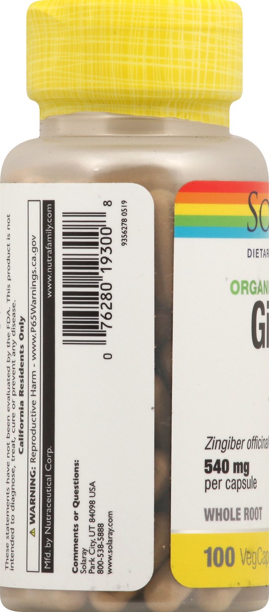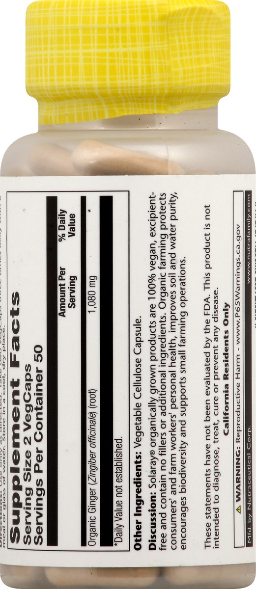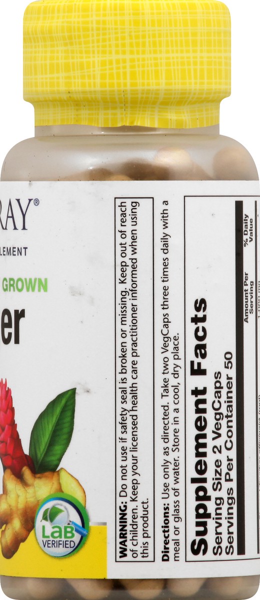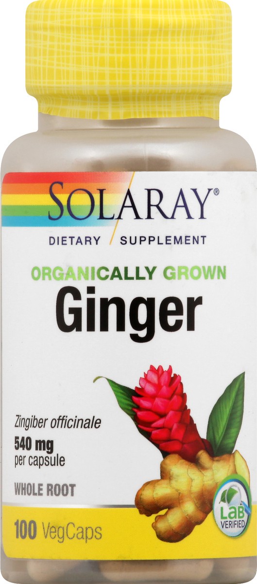 Dietary Supplement. 100% Vegan. Non-GMO. Zingiber officinale 540 mg per capsule. Whole root. Organically grown. Lab verified. Discussion: Solaray organically grown products are 100% vegan, excipient-f…