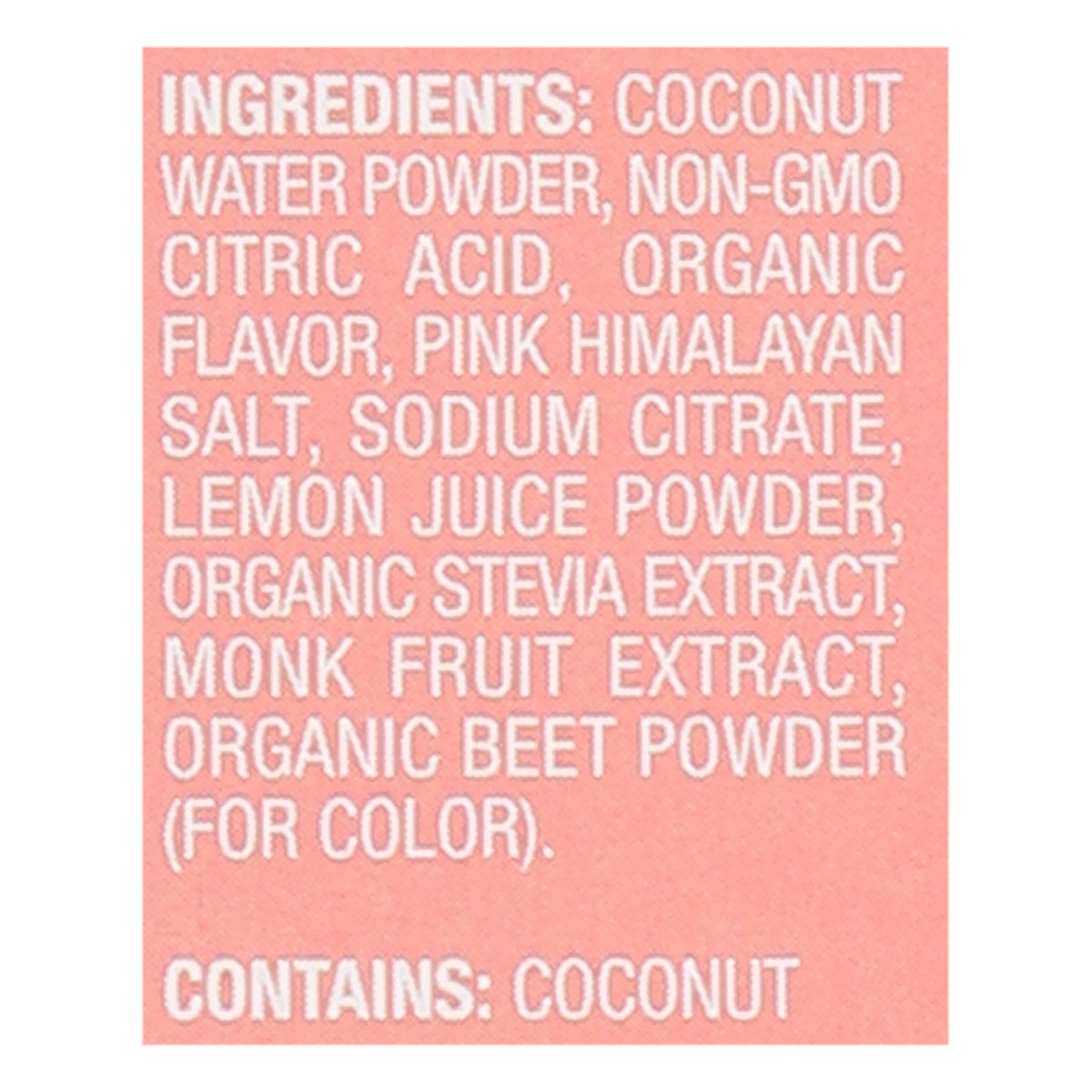 Coconut Water Powder, Non-GMO Citric Acid, Organic Flavor, Pink Himalayan Salt, Sodium Citrate, Lemon Juice Powder, Organic Stevia Extract, Monk Fruit Extract, Organic Beet Powder (for Color).