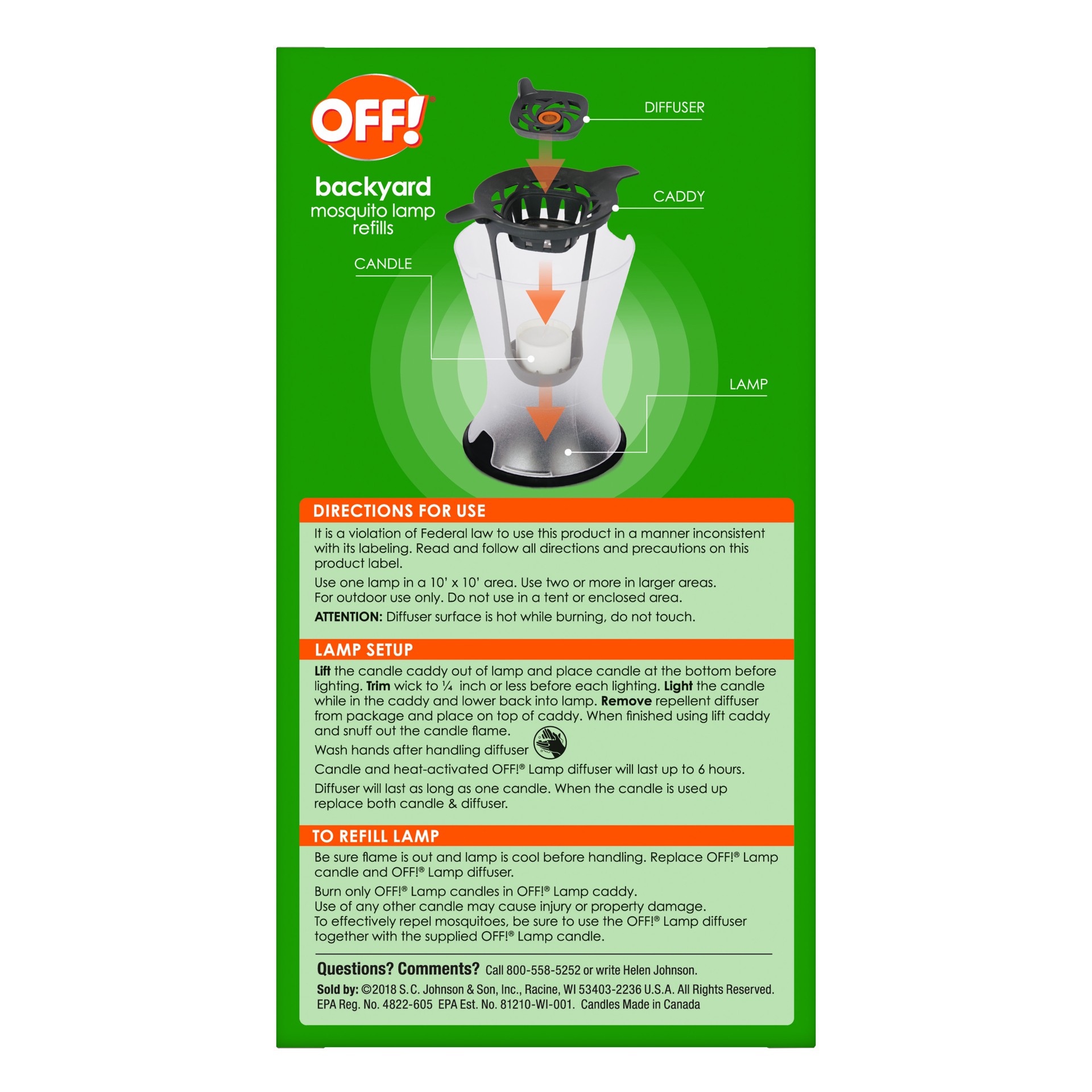 Refillable lamp. Repels mosquitoes up to 10 x 10 ft. Each diffusers lasts up to 6 hours. Diffuser. Caddy. Candle. Lamp. A family company since 1886. - Fisk Johnson.