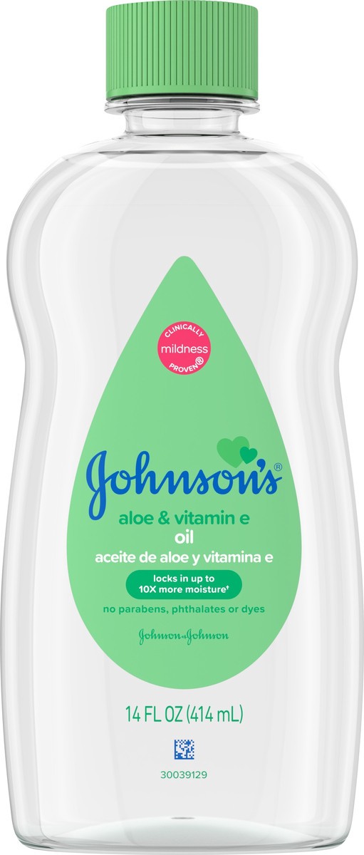 Johnson's Baby Oil, Mineral Oil with Aloe Vera & Vitamin E helps to Prevent Moisture Loss, Soothing, Moisturizing Baby Massage Oil, 14 fl. oz