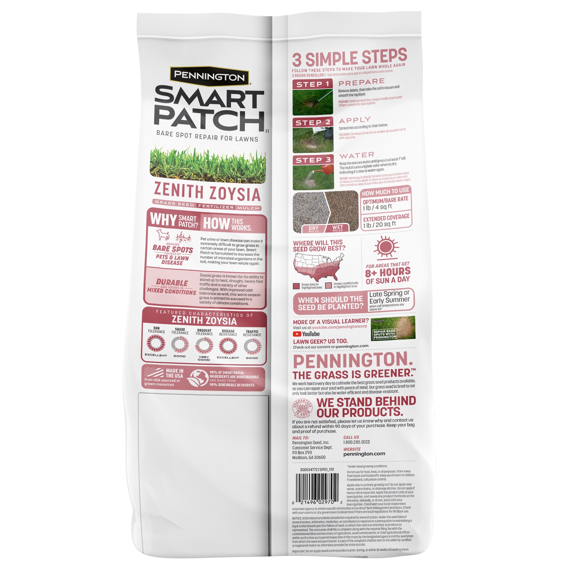 Smart Seed grass seed, fertilizer and mulch repairs bare spots in lawn. Contains a tackifier to protect seed on slopes, hills and rain. Includes Pennington Zoysia grass for sunny areas. Contains micro…