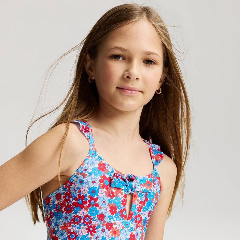 Brighten up your child's swimwear with this Floral One-Piece Swimsuit from Cat & Jack™. Adorned with a vibrant floral print in blue, pink and red shades on a white backdrop, this tricot swimsuit is cr…