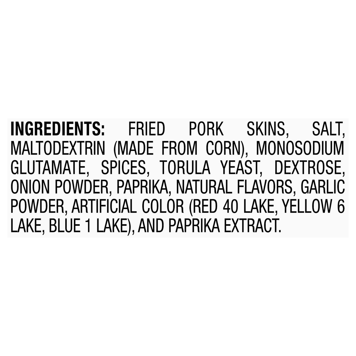 Fried Pork Skins, Salt, Maltodextrin (Made from Corn), Monosodium Glutamate, Spices, Torula Yeast, Dextrose, Onion Powder, Paprika, Natural Flavors, Garlic Powder, Artificial Color (Red 40 Lake, Yello…