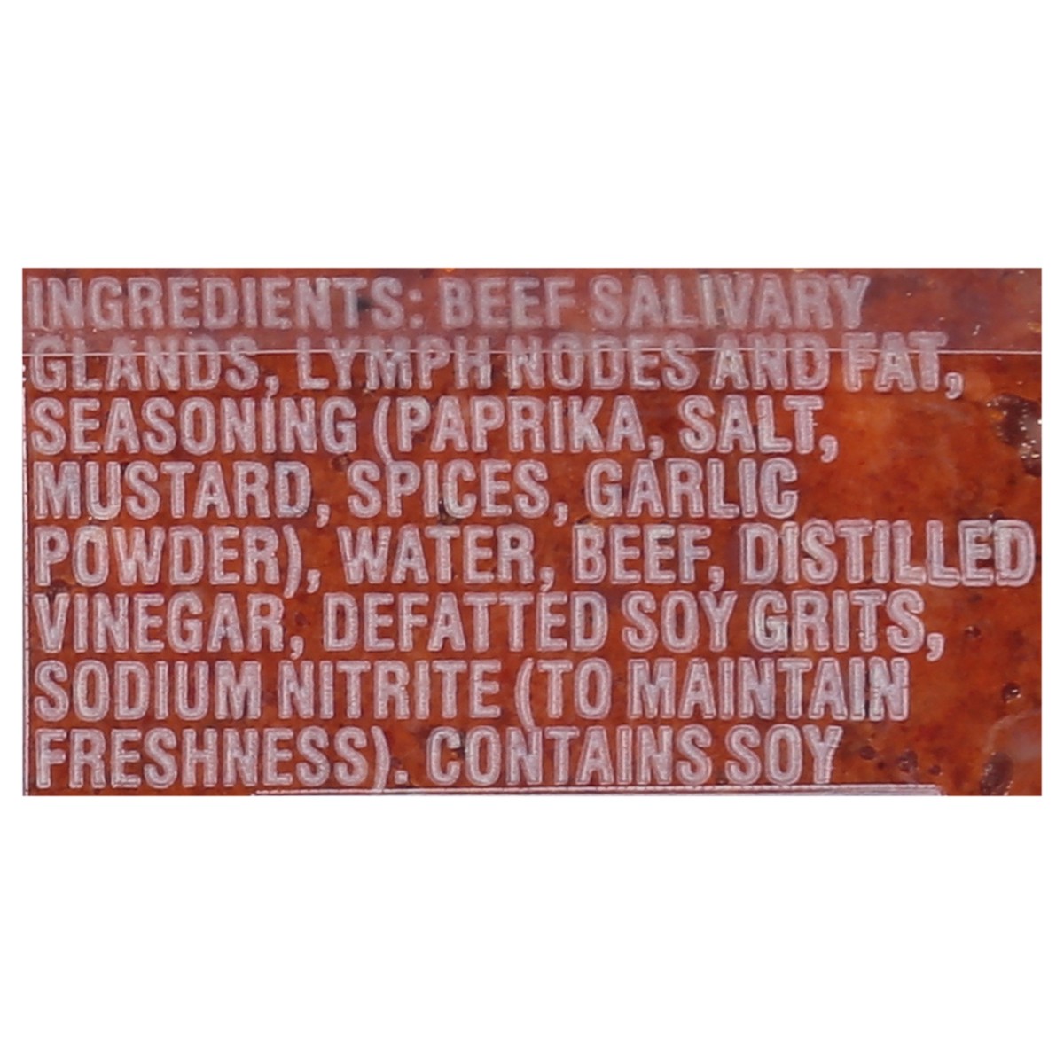 Beef Salivary Glands, Lymph Nodes and Fat, Seasoning (Paprika, Salt, Mustard, Spices, Garlic Powder), Water, Beef Distilled Vinegar, Defatted Soy Grits, Sodium Nitrite (to Maintain Freshness).