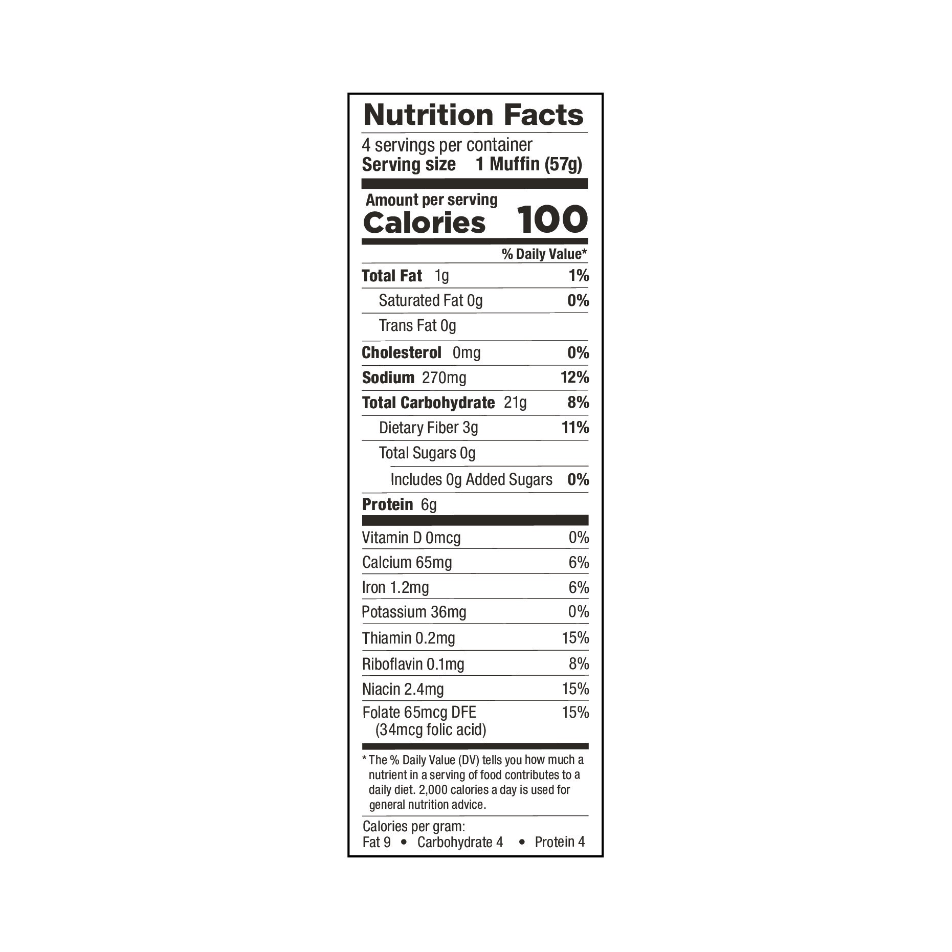 No artificial colors or flavors. Now with 100 calories per muffin. Per 1 Muffin Serving: 100 calories; 0 g sat fat (0% DV); 270 mg sodium (12% DV); 0 g total sugars; 3 g fiber (11% DV). The Original D…