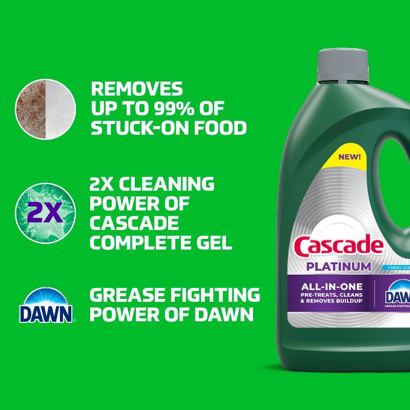 - 2X CLEANING POWER: Cascade Platinum Gel has 2X the Cleaning Power* of Cascade Complete gel and is formulated with the grease-fighting power of Dawn *on starch & protein soils vs. Cascade Complete Gel