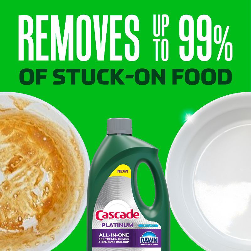 Cascade Platinum Gel dishwasher detergent removes up to 99% of stuck-on food for an all-in-one clean. That's because Cascade Platinum Gel dishwasher detergent has 2X the Cleaning Power* of Cascade Com…
