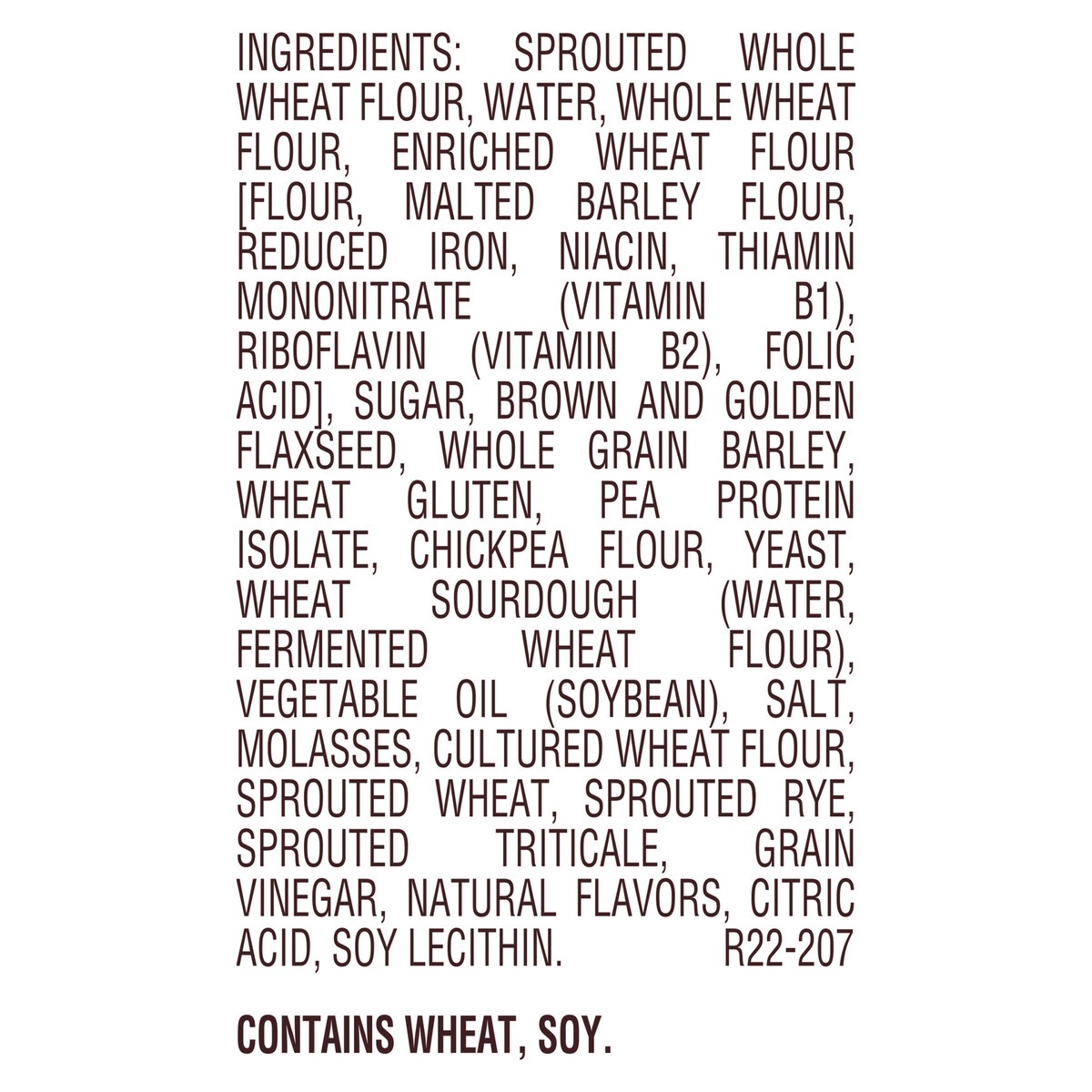 Sprouted Whole Wheat Flour, Water, Whole Wheat Flour, Enriched Wheat Flour [Flour, Malted Barley Flour, Reduced Iron, Niacin, Thiamin Mononitrate, Riboflavin, Folic Acid], Sugar, Brown And Golden Flax…