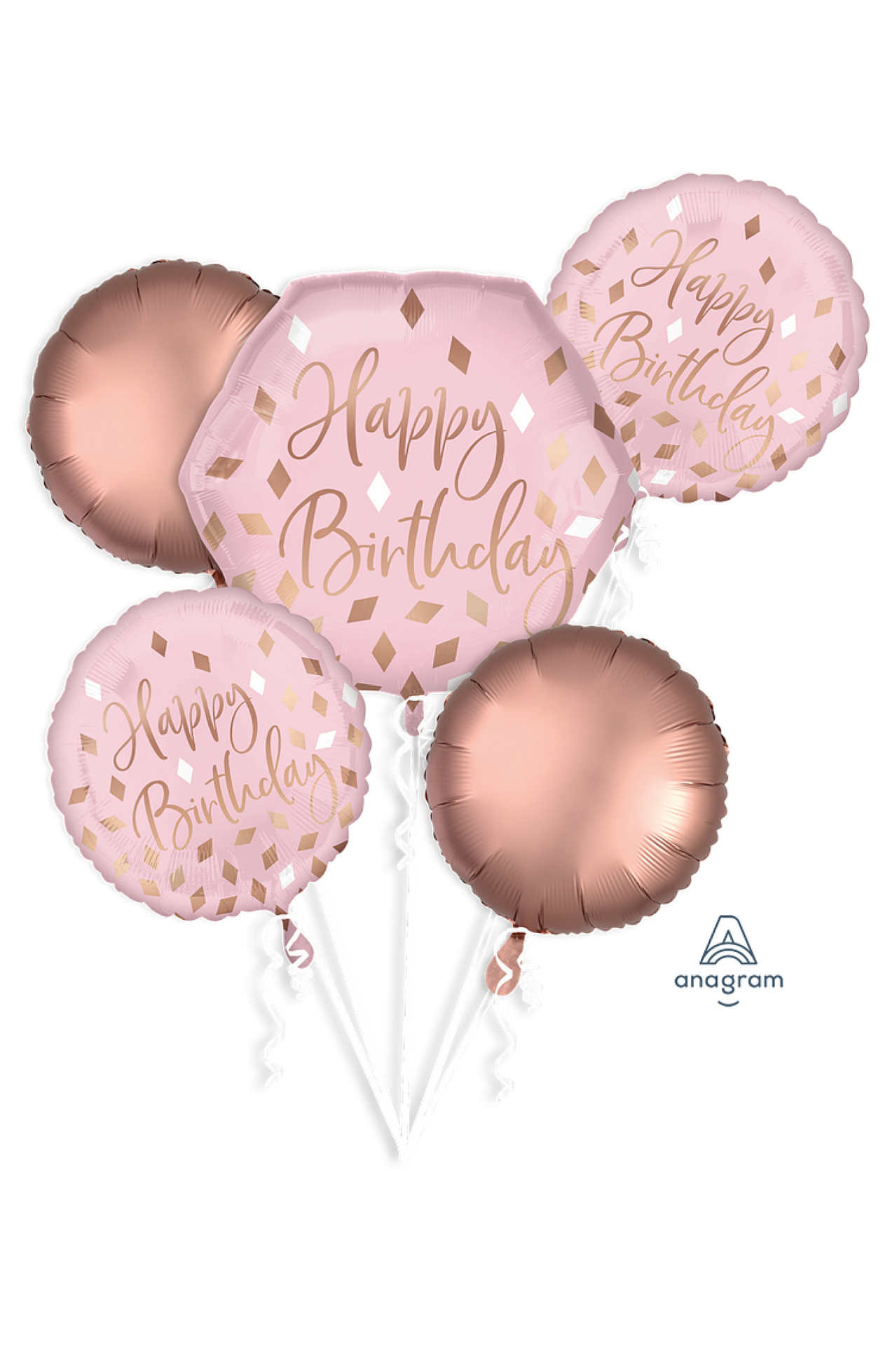 Decorate for a pretty in pink birthday party with this balloon bouquet. This balloon includes a pink hexagonshaped balloon features the headline Happy Birthday in rosegold diamond confetti. Matching r…
