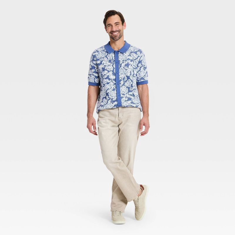 Men's Floral Print Short Sleeve Full-Button Polo Sweater - Goodfellow & Co™ Blue L