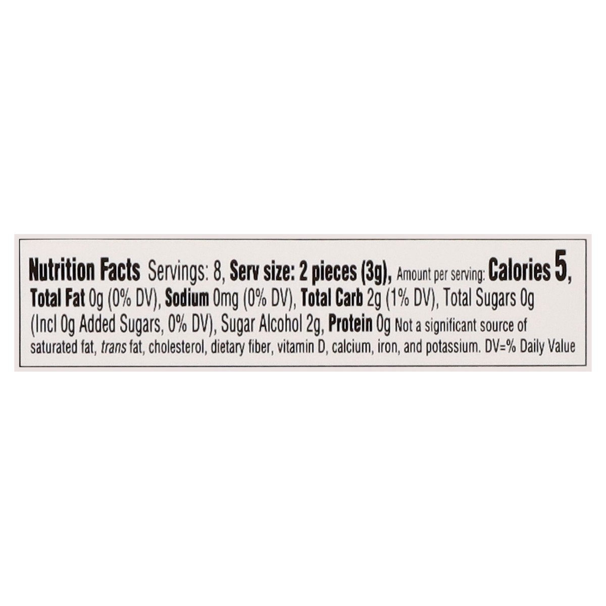 Sorbitol, Gum Base, Maltitol, Natural and Artificial Flavor, Mannitol; Less than 2% of: Acacia, Acesulfame Potassium, BHT (to Maintain Freshness), Blue 2 Lake, Candelilla Wax, Glycerin, Red 40 Lake, S…
