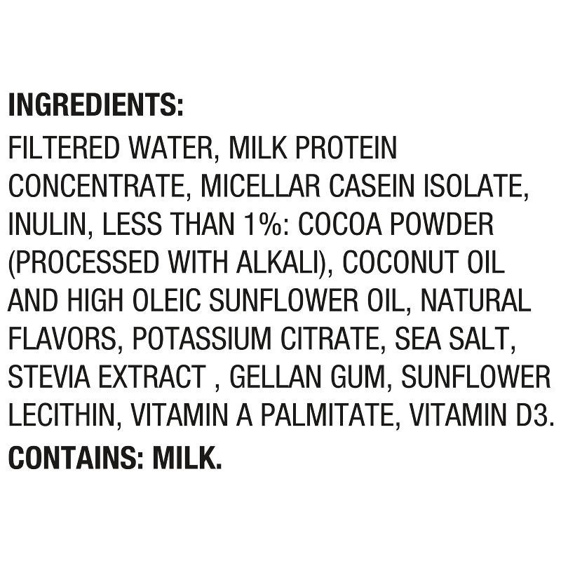 FILTERED WATER, MILK PROTEIN CONCENTRATE, MICELLAR CASEIN ISOLATE, INULIN, LESS THAN 1%: COCOA POWDER (PROCESSED WITH ALKALI), COCONUT OIL AND HIGH OLEIC SUNFLOWER OIL, NATURAL FLAVORS, POTASSIUM CITR…