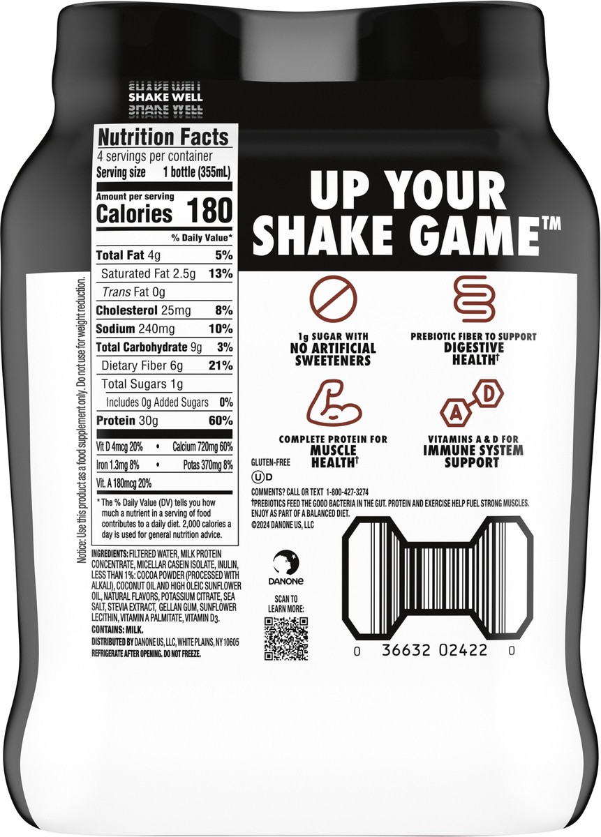 Filtered Water, Milk Protein Concentrate, Micellar Casein Isolate, Inulin, Less than 1%: Cocoa Powder (Processed with Alkali), Coconut Oil and High Oleic Sunflower Oil, Natural Flavors, Potassium Citr…