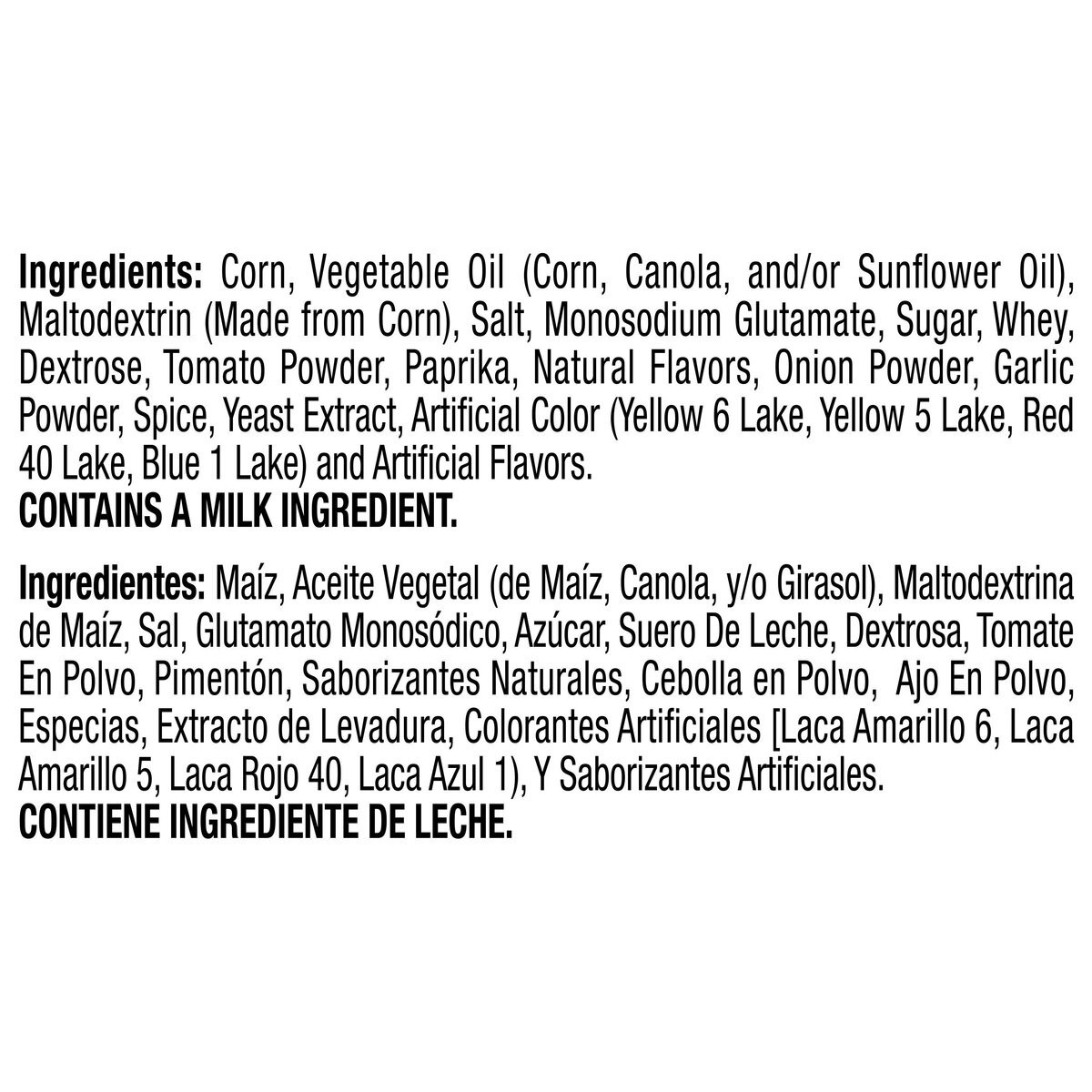 Ingredients: Corn, Vegetable Oil (Corn, Canola, and/or Sunflower Oil), Maltodextrin (Made from Corn), Salt, Monosodium Glutamate, Sugar, Whey, Dextrose, Tomato Powder, Paprika, Natural Flavors (Includ…