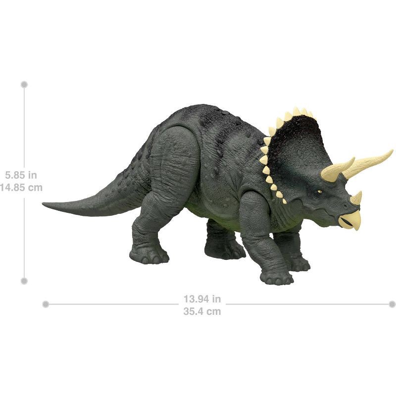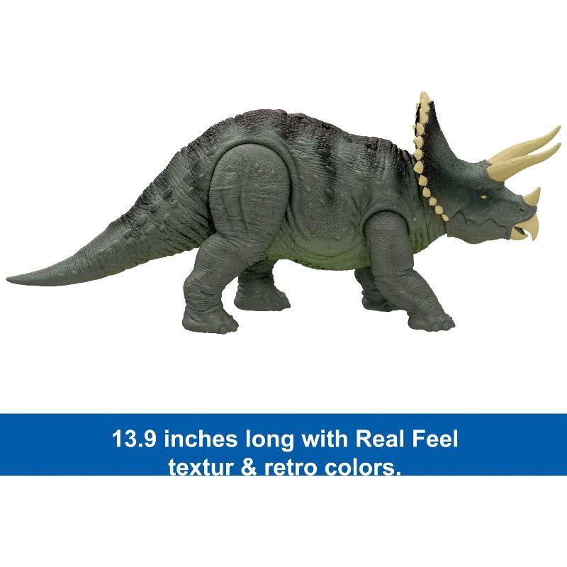 With sound, Real Feel texture and a bold color design, this Jurassic World Reimagined Triceratops brings back the 90s with a detailed dinosaur action figure. At 13.9 inches long and 5.8 inches tall wi…