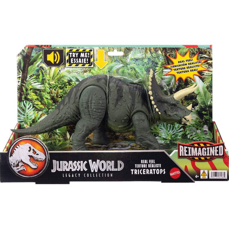 - Real Feel! This Jurassic World Reimagined Triceratops figure has Real Feel texture on its entire torso, adding to its detailed sculpt and retro 90s-themed colors.