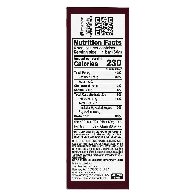 - Kosher and gluten free protein bars with 18 grams of protein and 1 gram of sugar made with real HERSHEY'S cocoa