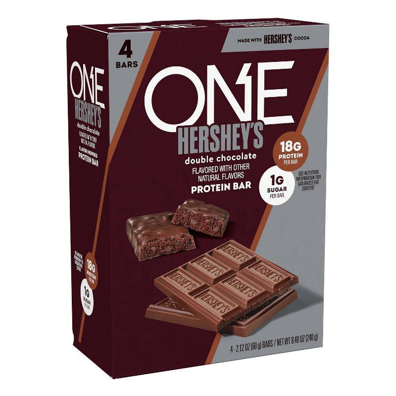 - Contains four (4) 2.12-ounce ONE HERSHEY'S Double Chocolate Flavored Protein Bars