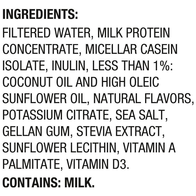 FILTERED WATER, MILK PROTEIN CONCENTRATE, MICELLAR CASEIN ISOLATE, INULIN, LESS THAN 1%: COCONUT OIL AND HIGH OLEIC SUNFLOWER OIL, NATURAL FLAVORS, POTASSIUM CITRATE, SEA SALT, GELLAN GUM, STEVIA EXTR…