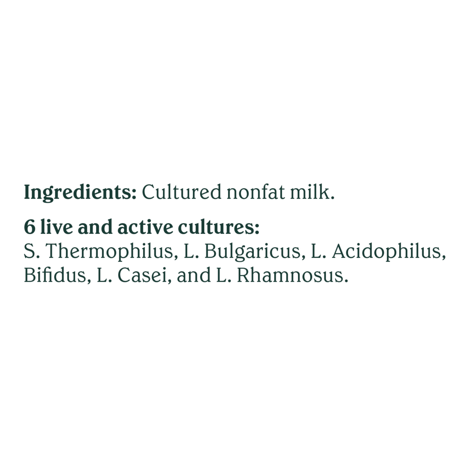 Cultured Nonfat Milk. 6 Live and Active Cultures: S. Thermophilus, L. Bulgaricus, L. Acidophilus, Bifidus, L. Casei, and L. Rhamnosus.