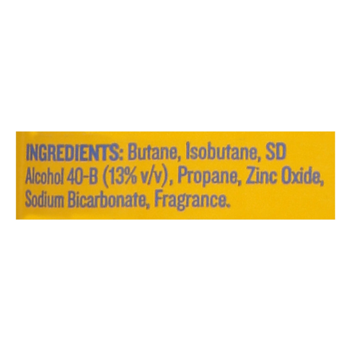 Butane, Isobutane, SD Alcohol 40-B (17.2% V/V), Propane, Zinc Oxide, Sodium Bicarbonate, Linalool, Limonene, Fragrance.