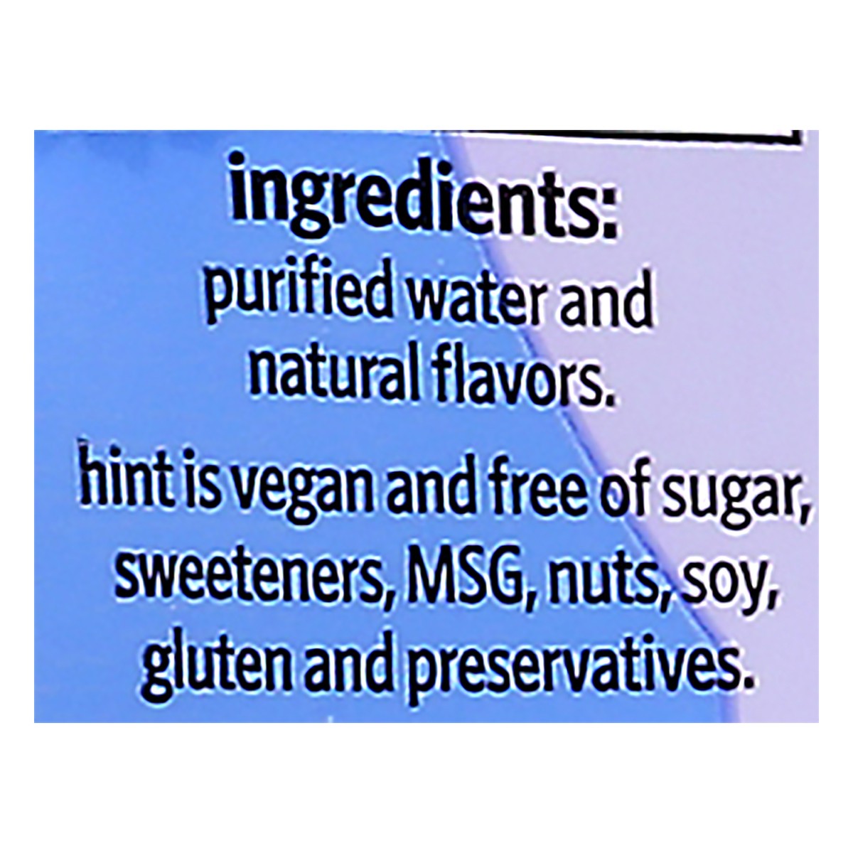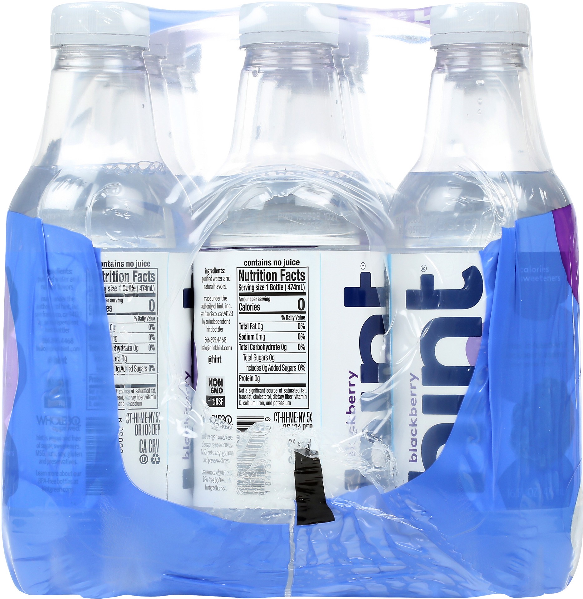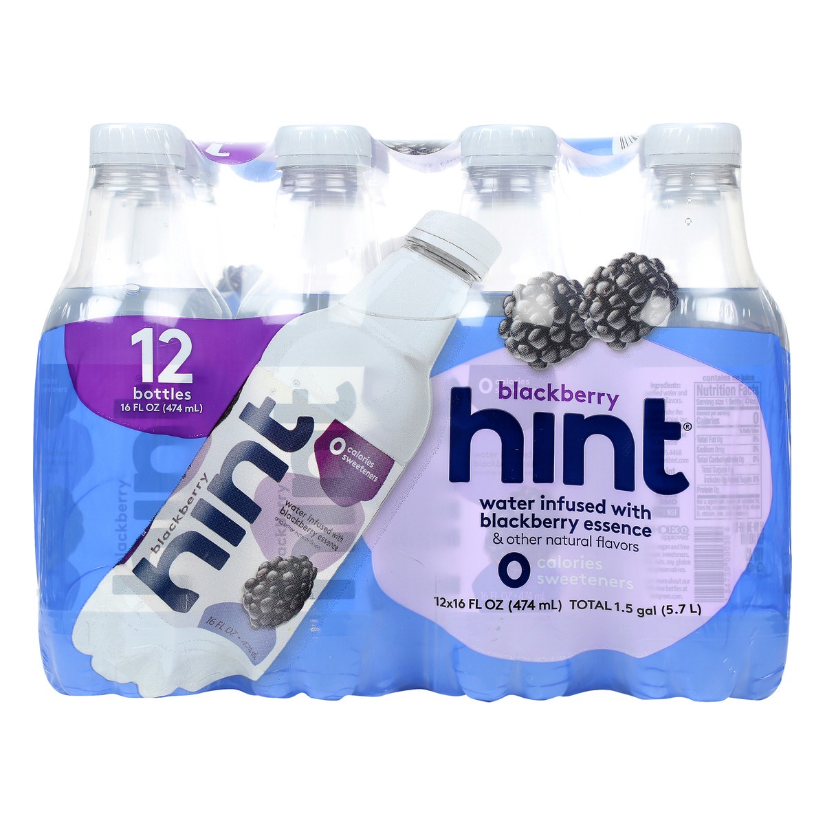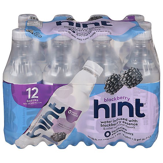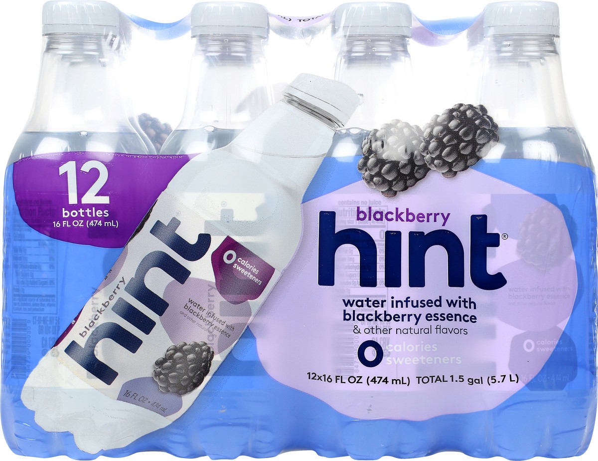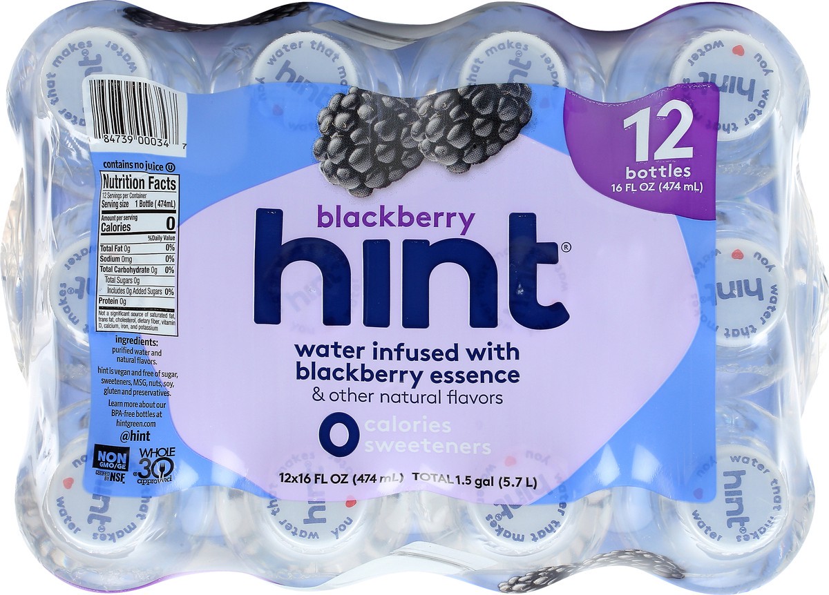 Water infused with blackberry essence & other natural flavors. 0 calories; 0 sweeteners. Hint is vegan and free of sugar, sweeteners, MSG, nuts, soy, gluten and preservatives. Non GMO. Certified by NS…