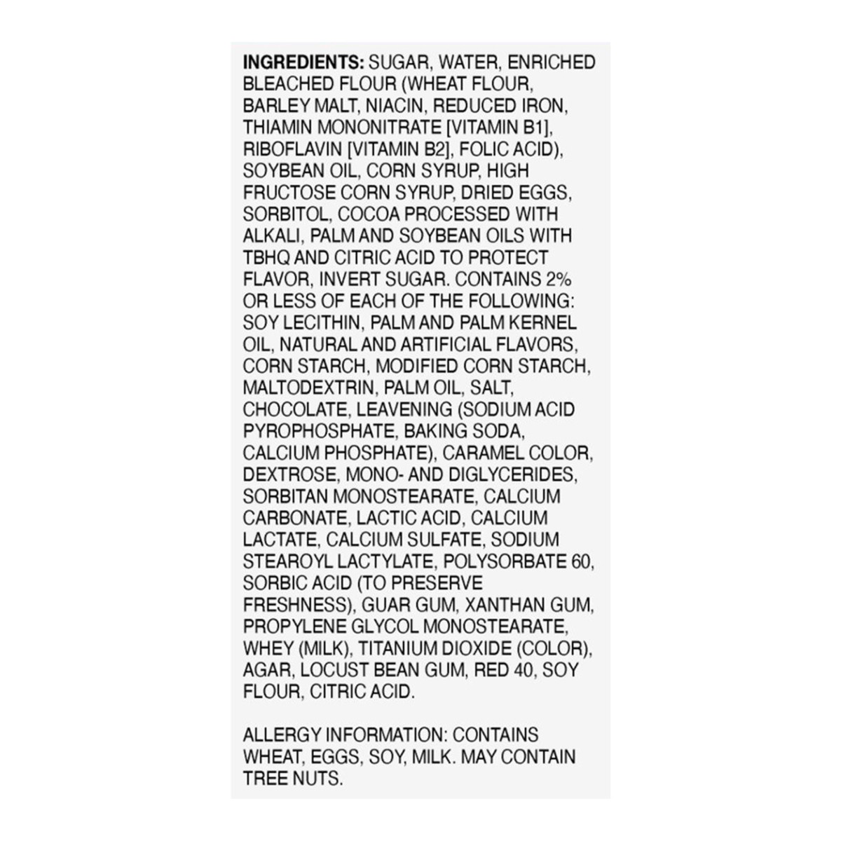 Sugar, Water, Enriched Bleached Flour (Wheat Flour, Barley Malt, Niacin, Reduced Iron, Thiamin Mononitrate [Vitamin B1], Riboflavin [Vitamin B2], Folic Acid), Soybean Oil, Corn Syrup, High Fructose Co…