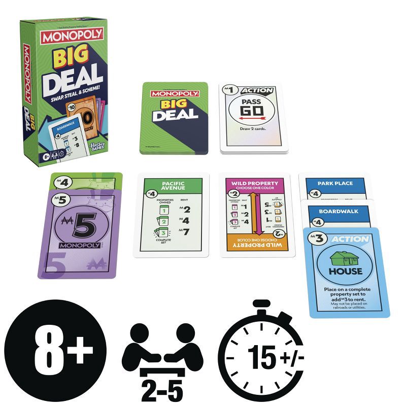 Make a fortune fast, in a BIG way! In the Monopoly Big Deal card game, play with oversized cards—4 times larger than in the original game! Players can still enjoy the classic Monopoly Deal gameplay th…