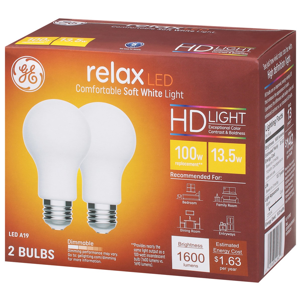 Brightness Quantity: 1600 lumens. Energy Info: $1.63 based on 3 hrs/day, 11¢ / kWh. Cost depends on rates and use. 13.5 watts. Package Info: 2. Voltage: . Bulb Info: LED. Is Dimmable. Screw. Bulb Life…
