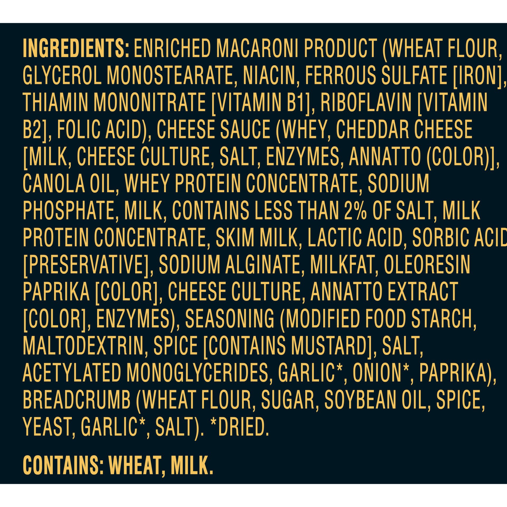ENRICHED MACARONI PRODUCT (WHEAT FLOUR, GLYCEROL MONOSTEARATE, NIACIN, FERROUS SULFATE [IRON], THIAMIN MONONITRATE [VITAMIN B1], RIBOFLAVIN [VITAMIN B2], FOLIC ACID), CHEESE SAUCE (WHEY, CHEDDAR CHEES…