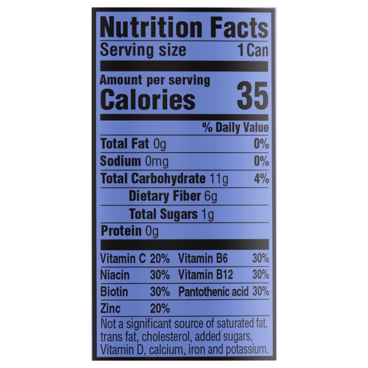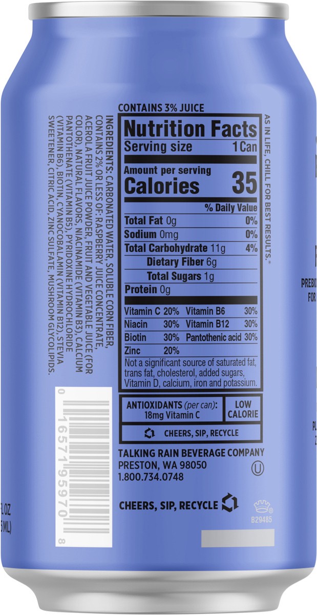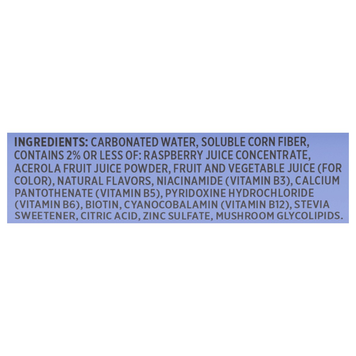 Carbonated Water, Soluble Corn Fiber, Contains 2% or Less of: Raspberry Juice Concentrate, Acerola Fruit Juice Powder, Fruit and Vegetable Juice (for Color), Natural Flavors, Niacinamide (Vitamin B3),…