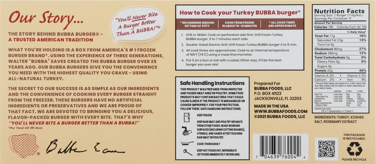 What do we mean when we say, “You''ll never bite a burger better than a BUBBA! ”? We make the Turkey BUBBA burger using only healthy, all-natural* 100% turkey made with kosher salt and rosemary extrac…