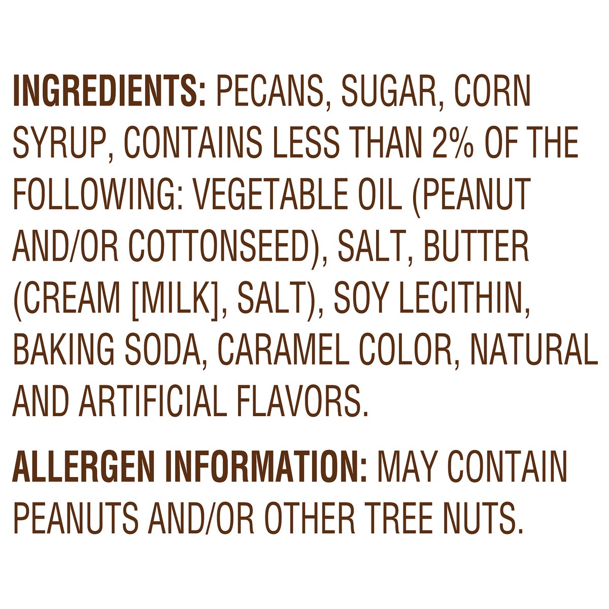 Pecans, Sugar, Corn Syrup, Contains Less than 2% of the Following: Vegetable Oil (Peanut, Cottonseed), Salt, Butter (Cream [Milk], Salt), Soy Lecithin, Baking Soda, Caramel Color and Natural and Artif…