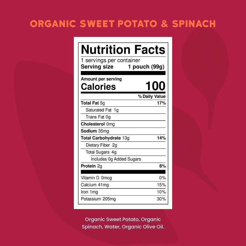 - Made with Organic Sweet Potato, Spinach and Organic Olive Oil