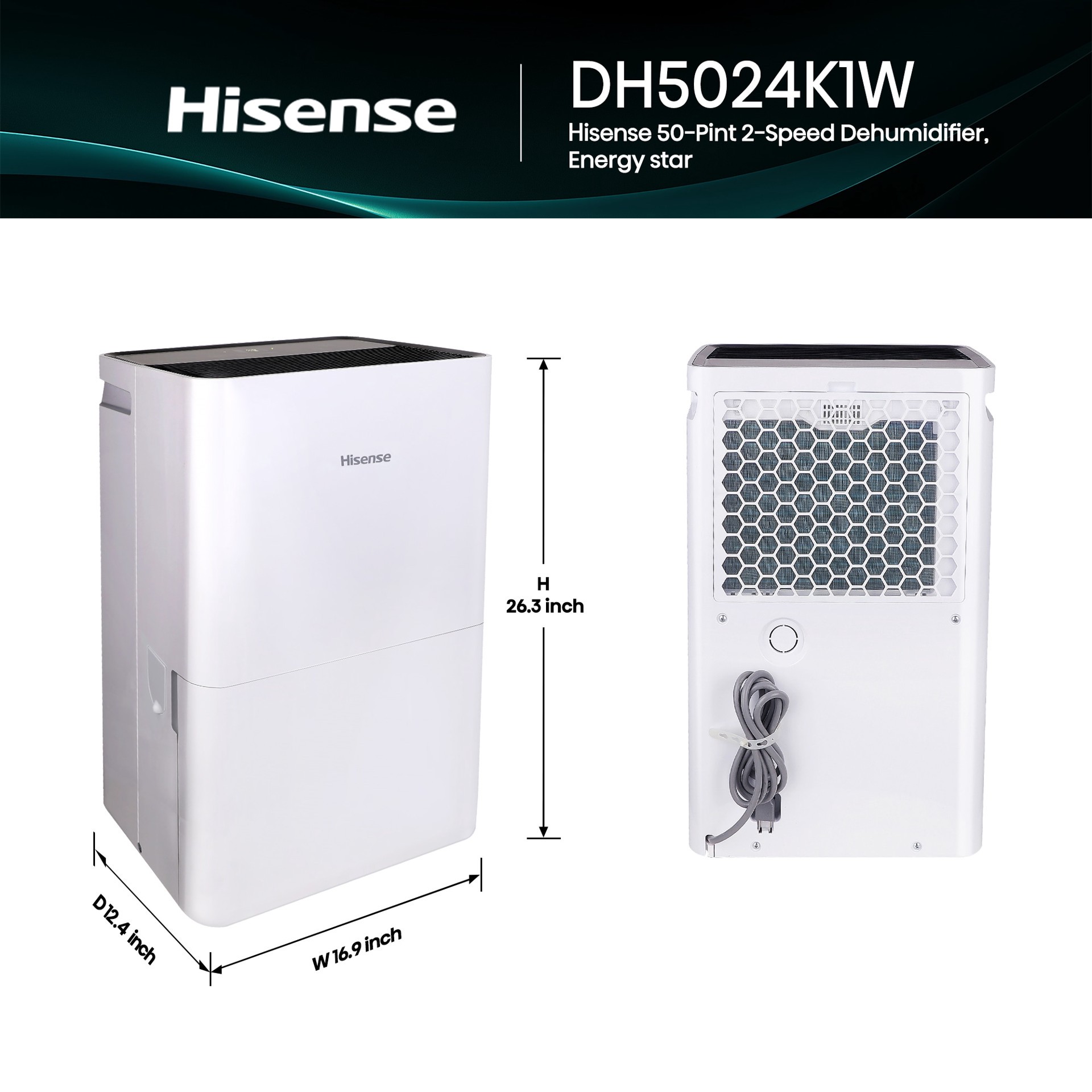 Hisense 50 -Pint Large Room Dehumidifier For Basements , Bathrooms , Crawlspaces , ENERGY STAR Certified White