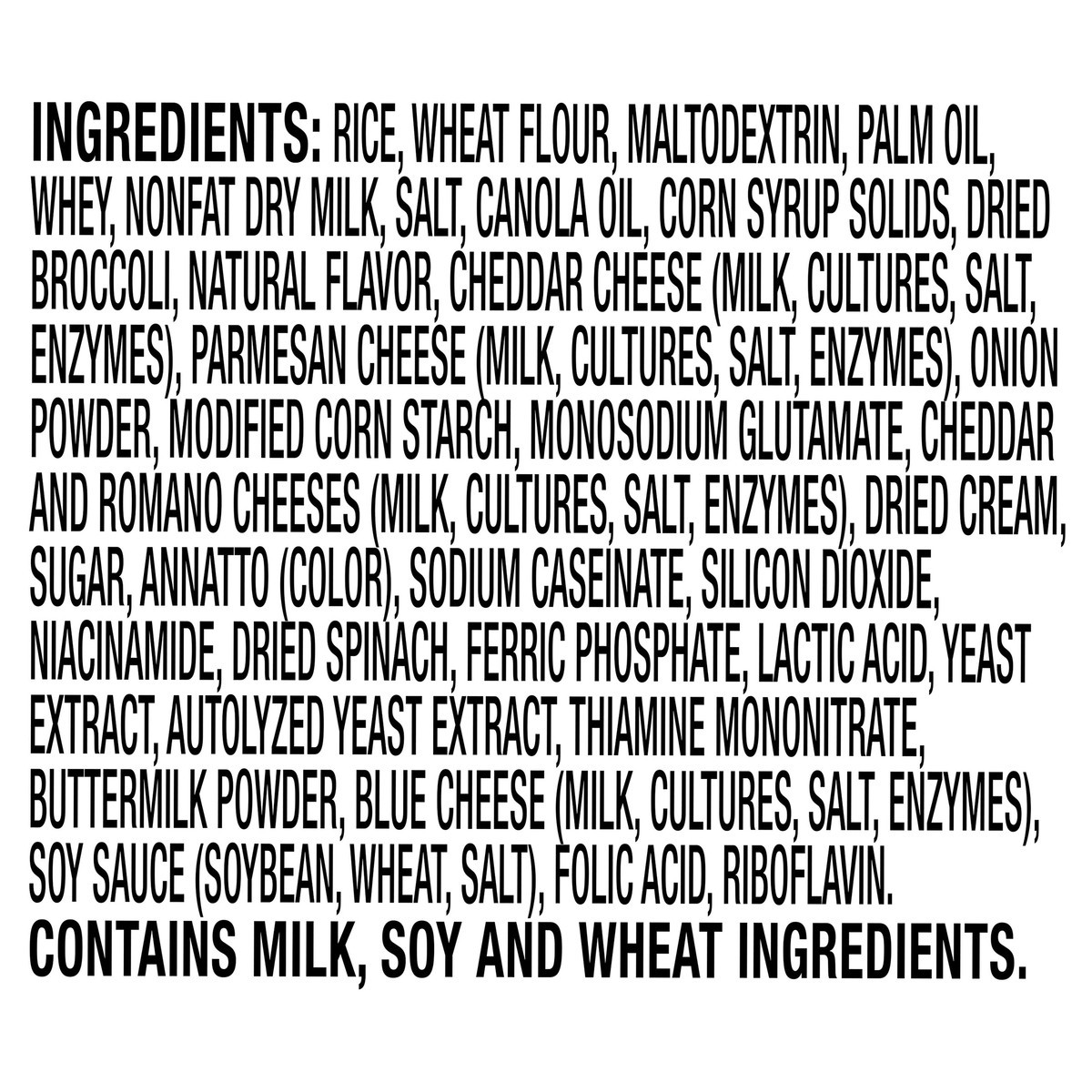 Rice, Wheat Flour, Maltodextrin, Palm Oil, Whey, Nonfat Dry Milk, Salt, Canola Oil, Corn Syrup Solids, Dried Broccoli, Natural Flavor, Cheddar Cheese (Milk, Cultures, Salt, Enzymes), Parmesan Cheese (…