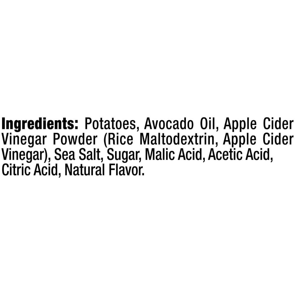 INGREDIENTS: POTATOES, AVOCADO OIL, APPLE CIDER VINEGAR POWDER (RICE MALTODEXTRIN, APPLE CIDER VINEGAR), SEA SALT, SUGAR, MALIC ACID, ACETIC ACID, CITRIC ACID, NATURAL FLAVOR.