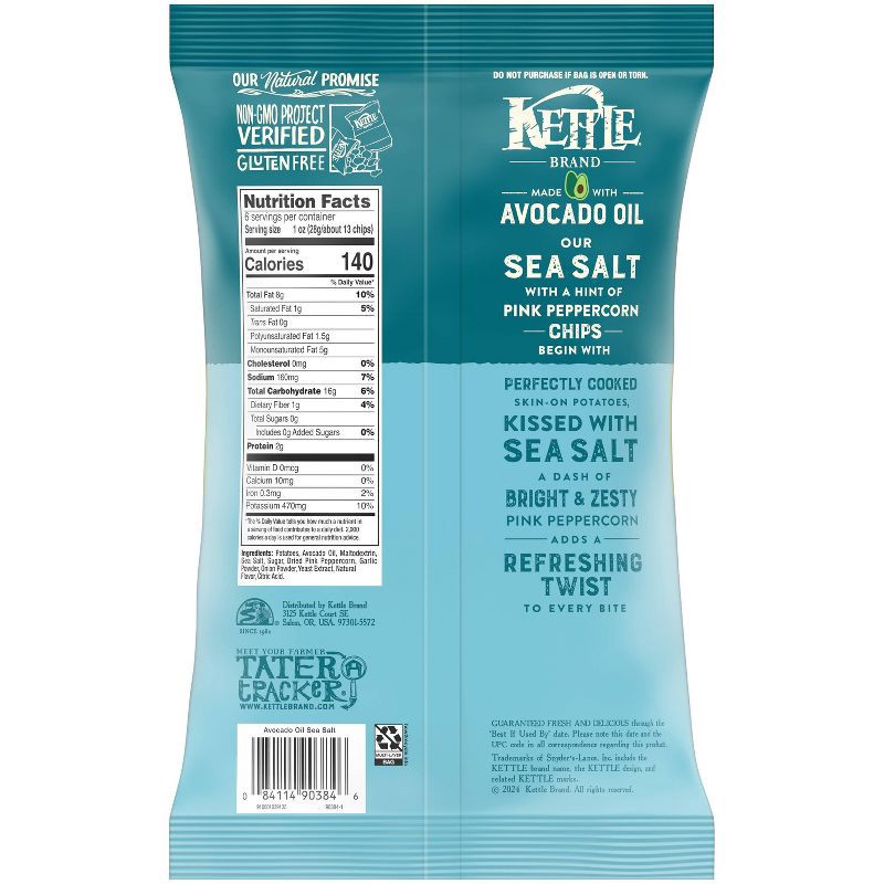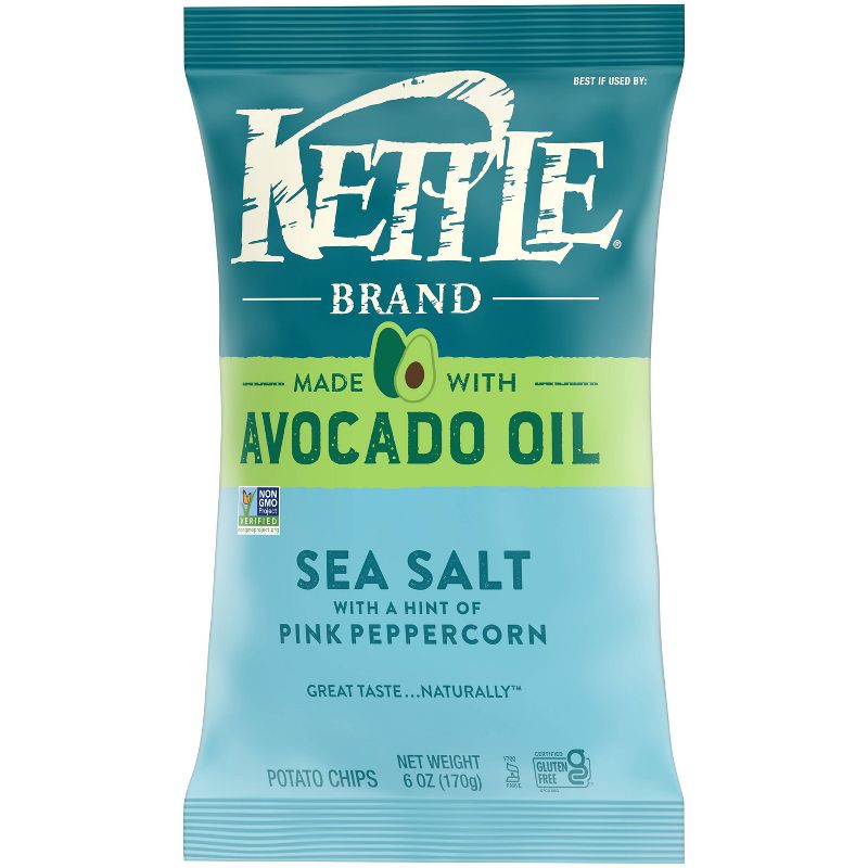 - Includes one (1) 6-ounce bag of Kettle Brand Made with Avocado Oil Sea Salt with a Hint of Pink Peppercorn Chips